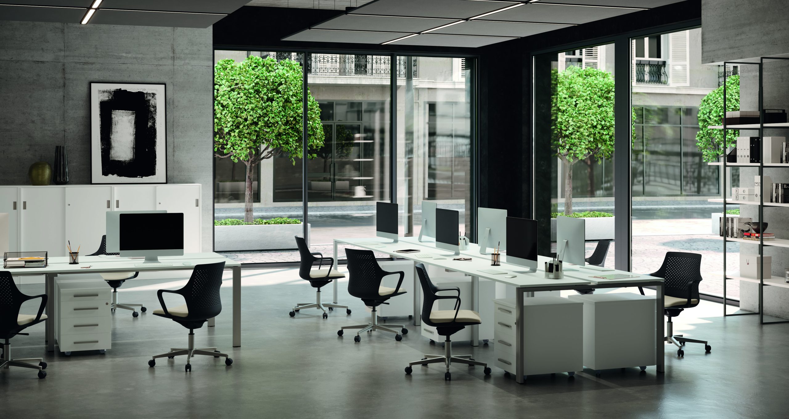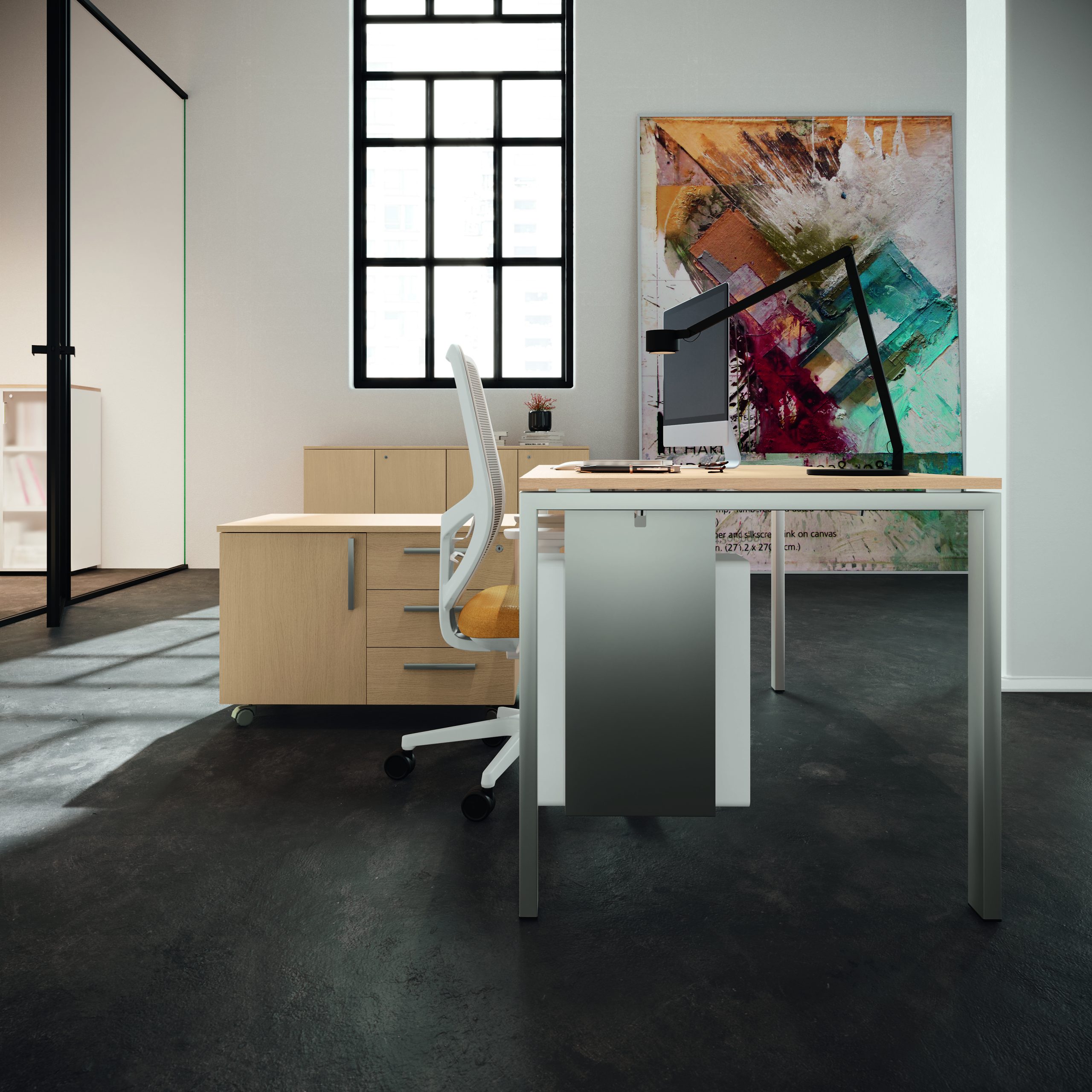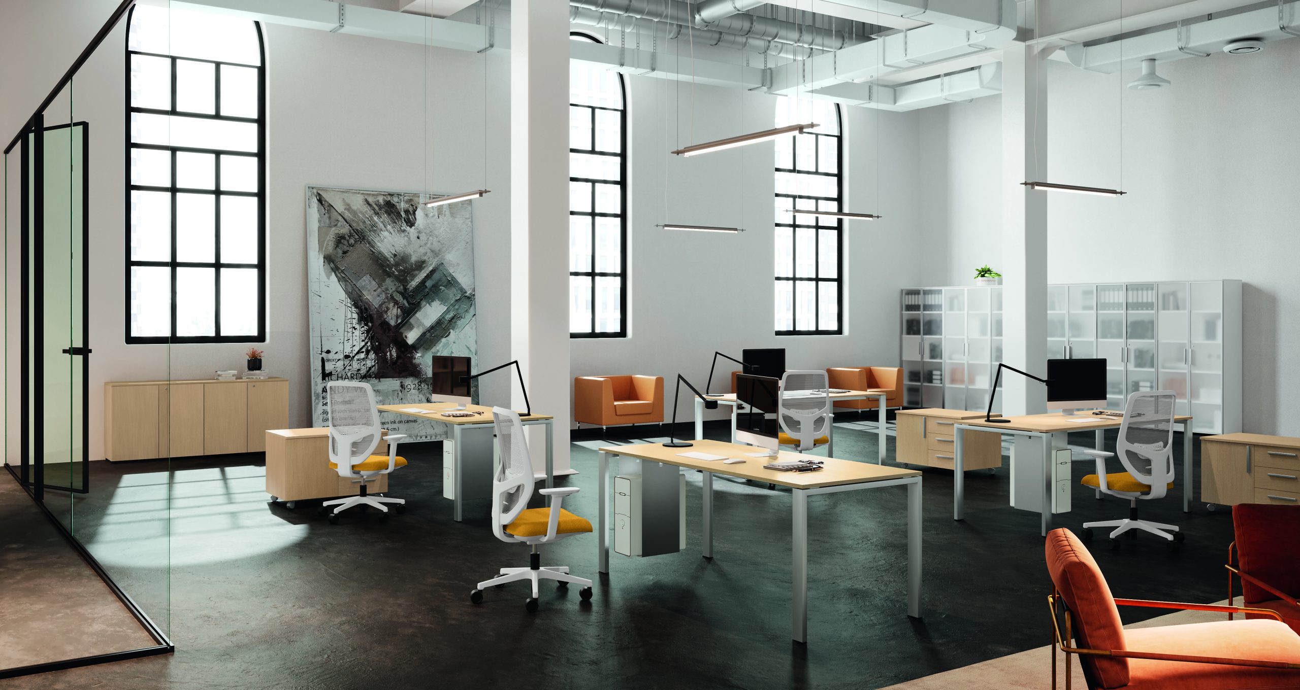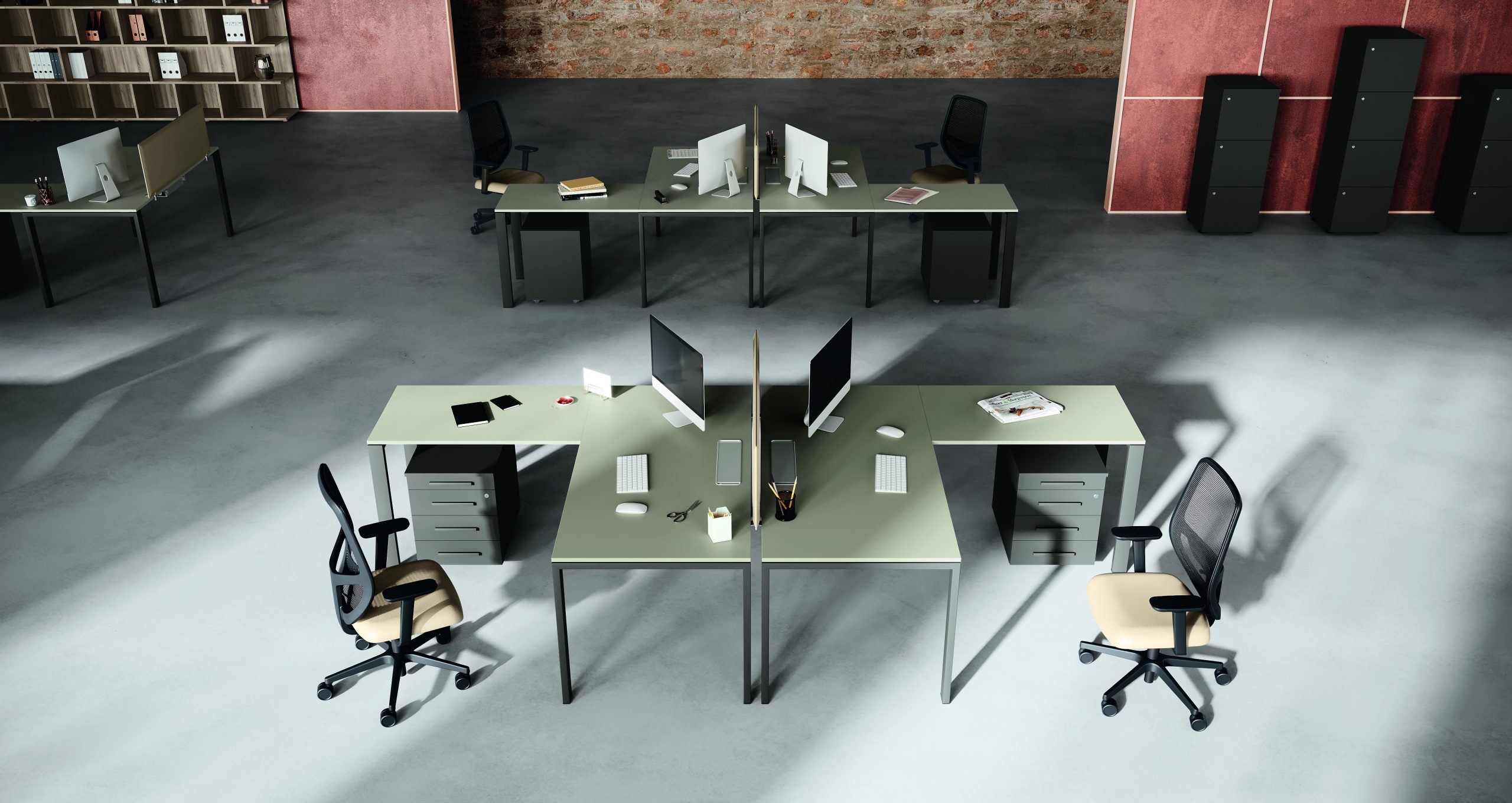 Ambienti architettonici che guardano con interesse il design e si distende nello spazio lavorativo invadendolo di colore. Le simmetrie delle linee convivono con l’inserimento di finiture materiche intervallate da elementi a giorno che creano giochi di volume caratterizzando le proposte descritte in questo catalogo. Composizioni armoniche declinate da vari elementi: mobili di base, librerie, scrivanie con varie soluzioni, elementi con alternanza di volumi.