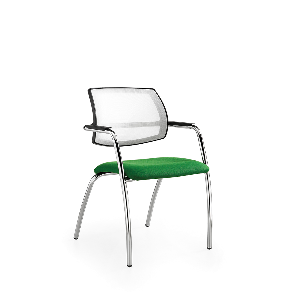 Seduta con schienale in rete dotato di supporto lombare e seduta imbottita. Disponibile con telai fissi cromati.